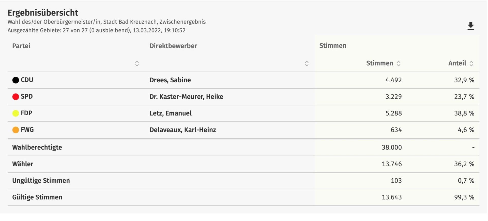 Bad Kreuznach hat am 13. März 2022 darüber abgestimmt, wer in den nächsten acht Jahren die Geschicke der Stadt als Oberbürgermeisterin beziehungsweise als Oberbürgermeister lenken soll: Eins Stunde nach Schließung der Wahllokale stehlt fest, dass Emanuel Letz (FDP) und Sabine Drees (CDU) in die Stichwahl gehen werden.