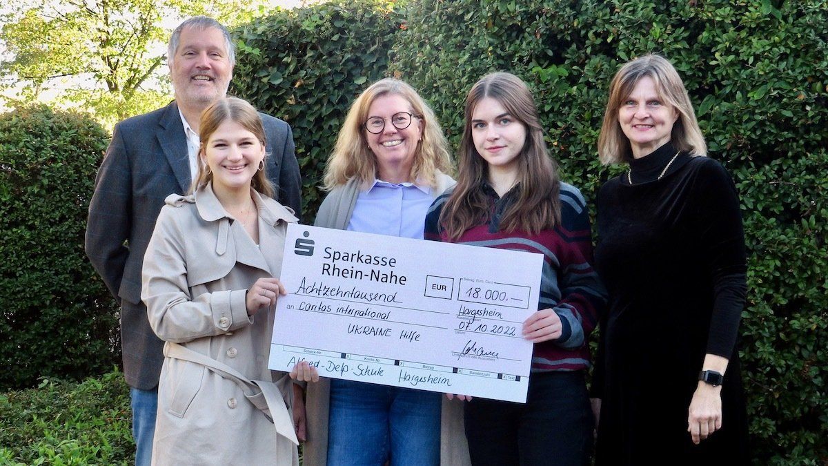 Eine Spende über 18.000 Euro leistete die Hargesheimer Alfred-Delp-Schule an „Caritas international“, das Hilfswerk des Deutschen Caritasverbandes. Gesamtschulleiter Dirk Johann, Sandra Trapp als Vorsitzende des Schulelternbeirates (SEB) sowie Elisabeth Hellgren und Josephine Robra aus der Schülervertretung (SV) überreichten einen Scheck mit dem Verwendungszweck „Ukraine-Hilfe“.