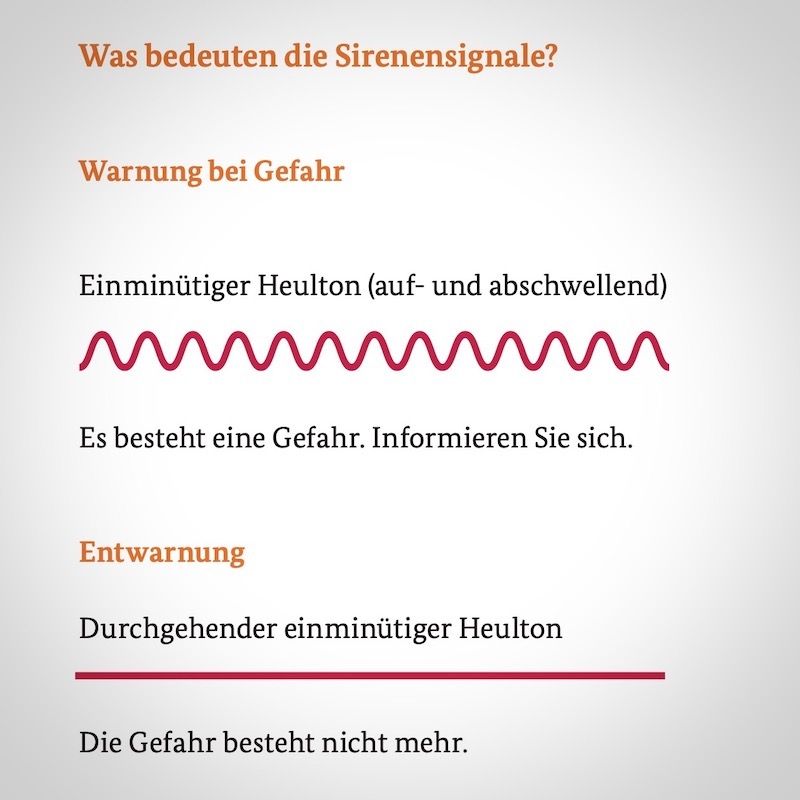 Das einminütige auf- und abschwellende Sirenensignal warnt die Bevölkerung vor akuten Gefahren wie Unwetter oder Großbränden. Nach dem Warnsignal sollte man Radio, Internet oder Warn-Apps einschalten und je nach Gefahrenlage Fenster sowie Türen schließen. Die Notrufleitungen sollen nicht blockiert werden. Nachbarn sowie Personen, die das Sirenensignal nicht wahrnehmen können, sollen informiert werden.