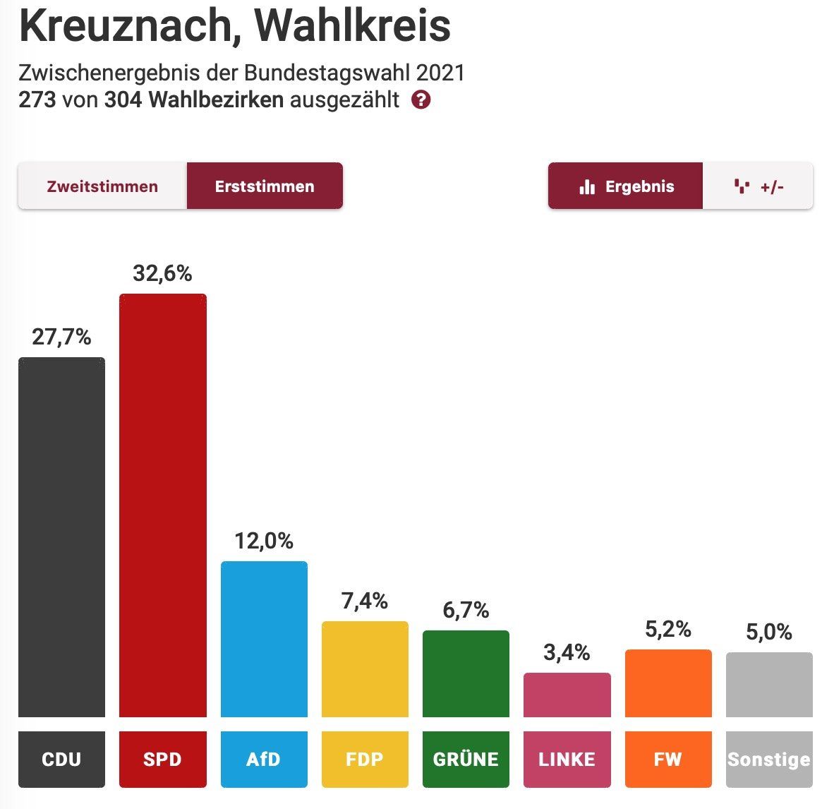 Gut die Hälfte der Wahlbezirke im Wahlkreis Bad Kreuznach ist ausgezählt und die SPD liegt bei den Zweitstimmen 8,3 % vor der CDU.