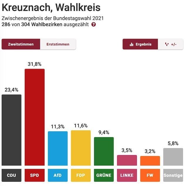 8,4 Prozent liegt die SPD bei den Zweitstimmen im Wahl Kreuznach vorn - 286 von 304 Wahlbezirken sind ausgezählt (VG Birkenfeld komplett)
