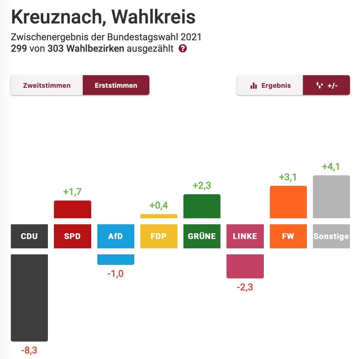 Die Verluste der CDU liegen im Wahlkreis Kreuznach im zweistelligen Bereich. Die weiteren Verlierer sind AfD und Linke